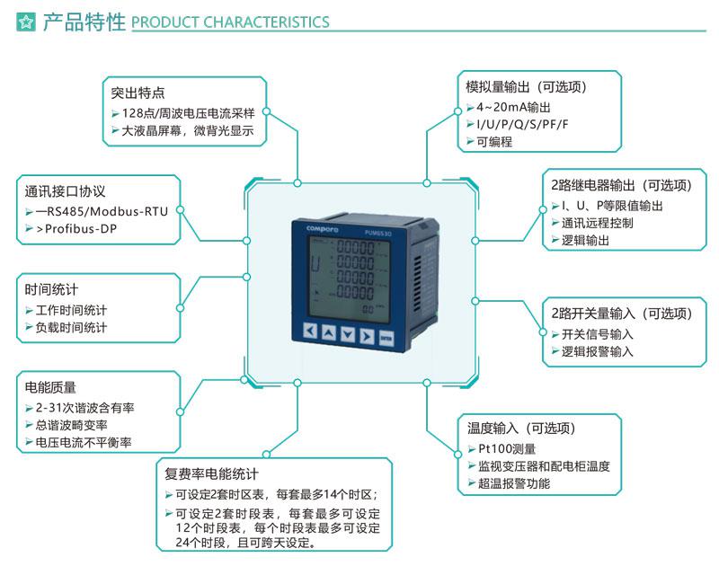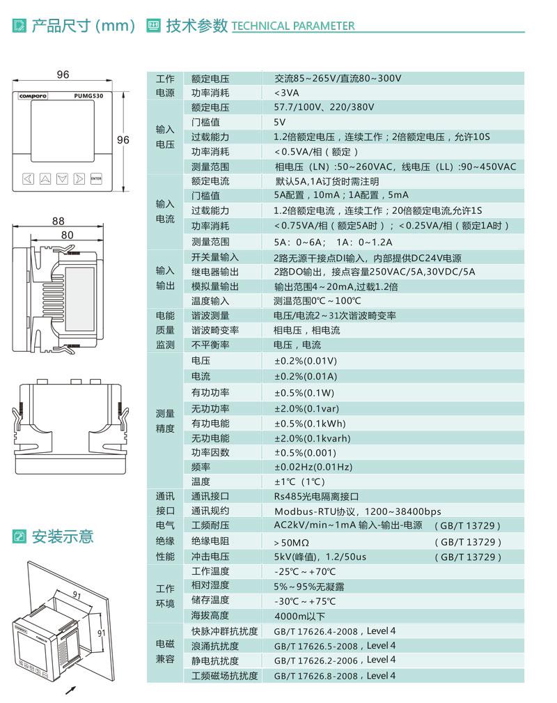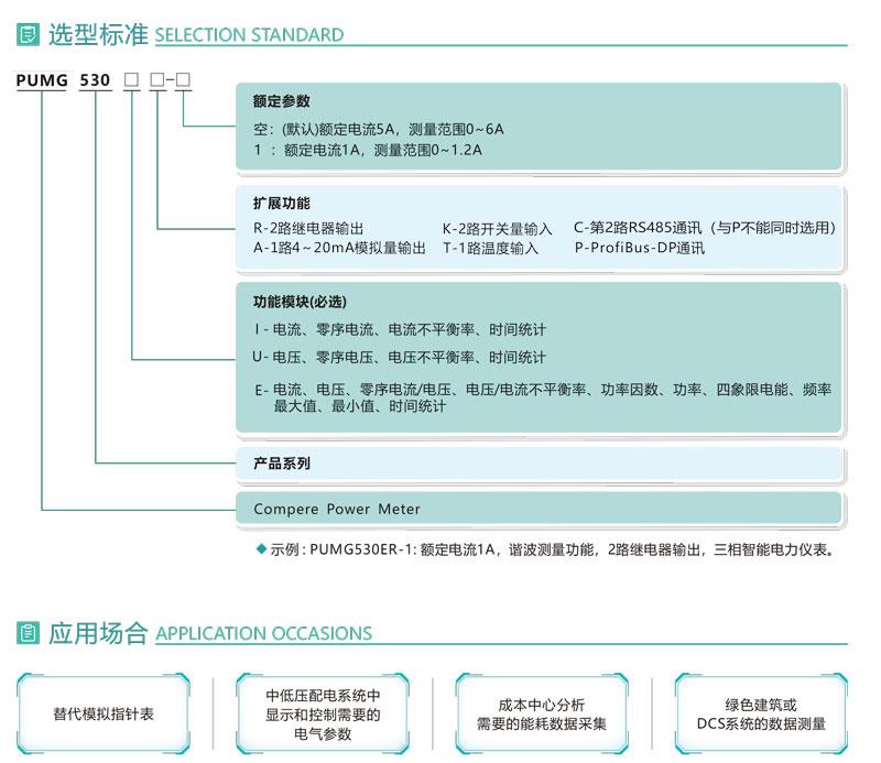 PUMG530系列三相智能電力儀表具有精確的電力參數測量功能,儀表采用先進的ARM處理器和數字信號處理技術設計而成;集三相電參量測量、顯示、電能統計、電能質量分析、數字輸入/輸出及網絡通訊于一體;具有精度高、隔離性強、性能穩定、抗干擾能力強等優點。該儀表還有很強的擴展功能,如監視外部開關動作、4~20mA模擬量輸出,還可以通過RS-485通訊實現儀表的網絡化管理。