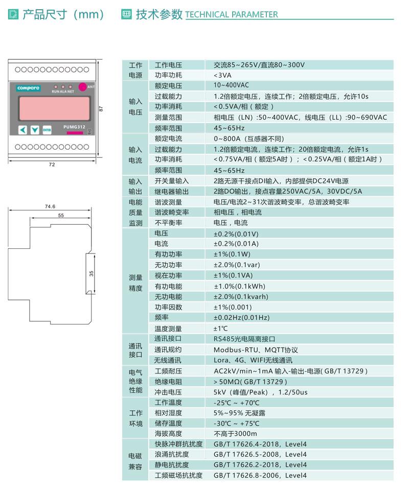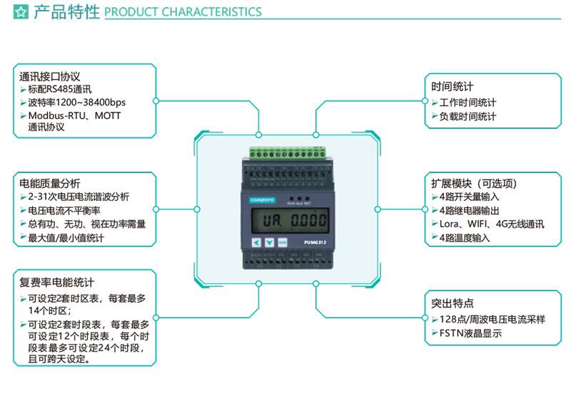 PUMG312系列三相導軌式智能電力能效終端采用DIN35mm 導軌式安裝結構和LCD液晶屏顯示,可測4個三相回路的電參量、2~31次諧波、統(tǒng)計運行時間等,標配1路RS485通訊接口,可通過Modbus -RTU或MQTT通訊協(xié)議實現(xiàn)儀表的網絡化管理。還可擴展4路開關量輸入和4路繼電器輸出,外接開口式互感器易于改造項目的施工。PUMG312具有體積小巧,精度高,可靠性好,安裝方便等優(yōu)點,多用于系統(tǒng)集成.