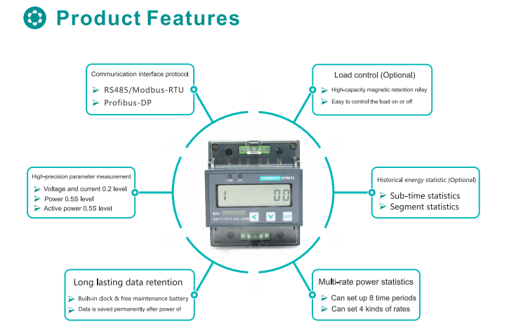 Example: KPM 31A-1.5(6):Rated AC220V /1.5A(Max 6A), basic type multi-rate energy statistics, historical energy statistics single-phase guideway type smart meter.