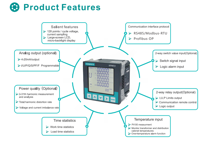 KPM53 series of three-phase smart power meter with accurate measurement of power parameters, the instrument uses advanced ARM processor and digital signal processing technology designed from the set of three-phase electrical parameters measurement, display, power statistics, power quality analysis, digital input / Output and network communications in one; with high precision, strong isolation, stable performance, anti-interference ability and a little; the instrument also has a very strong expansion capabilities, such as monitoring of external switching action, 4-20mA analog output, but also The network management of the instrument can be realized through RS-485 / Modbus communication protocol.