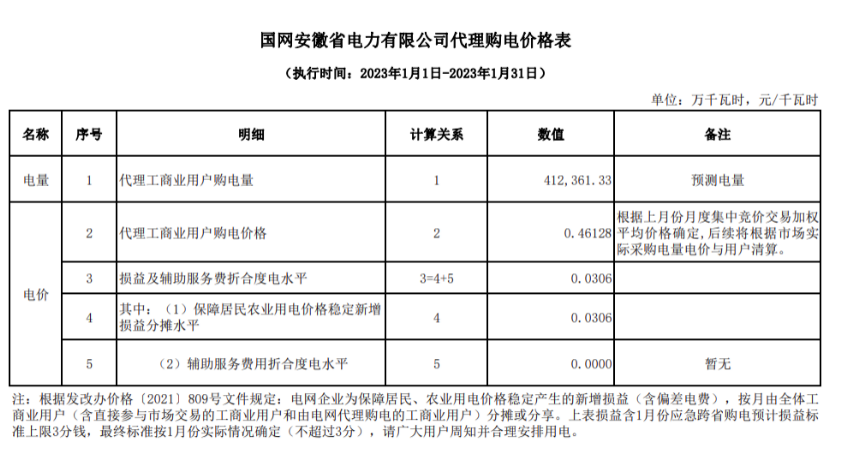 注:根據發改辦價格{2021}809號文件規定:電網企業為保障居民、農業用電價格穩定產生的新增損益(含偏差電費),按月由全體工商業用戶(含直接參與市場交易的工商業用戶和由電網代理購電的工商業用戶)分攤或分享。上表損益含1月份應急跨省購電預計損益標準上限3分錢,最終標準按1月份實際情況確定(不超過3分),請廣大用戶周知并合理安排用電。