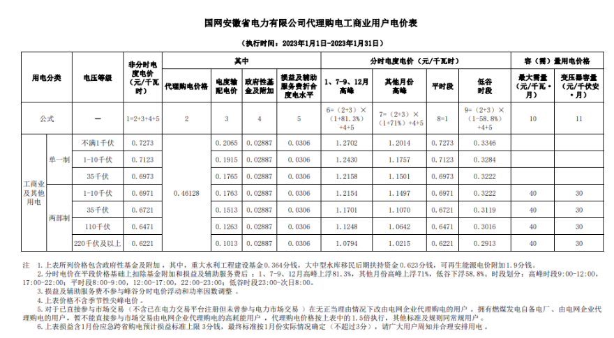 1、 安徽省一般工商業及大工業用戶分時電價和基本電費