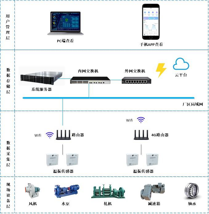 項目方案設計應用智能傳感、物聯網、移動通訊、大數據分析和人工智能技術等先進技術。在關鍵設備表面安裝振動、溫度等智能采集硬件,智能采集設備通過廠區Wifi網絡,將數據上傳至本地服務器/云服務器,實現關鍵設備運行狀態數據實時采集;平臺端進行數據處理與存儲,實現設備狀態實時顯示、異常智能預警、數據分析、操作記錄、報表統計等設備狀態監測業務。