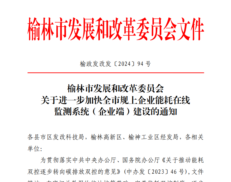 根據榆林市發展和改革委員會下發的文件通知,為加快推進榆林市重點用能單位能耗在線監測系統平臺建設,要求榆林市各企業年消耗 1000 噸標準煤以上或消耗電力 500 萬千瓦時以上的新建項目,在入統前均要接入市平臺,實現一級計量能源消耗和外供數據的實時采集。