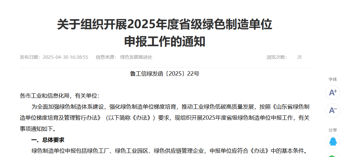 為全面加強綠色制造體系建設,強化綠色制造單位梯度培育,推動工業綠色低碳高質量發展,按照《山東省綠色制造單位梯度培育及管理暫行辦法》(以下簡稱《辦法》)要求,現組織開展2025年度山東省綠色工廠、綠色工業園區申報工作。