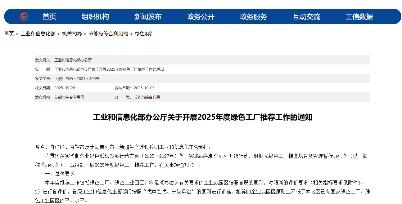 工業(yè)和信息化部辦公廳關(guān)于開展2025年度綠色工廠推薦工作的通知