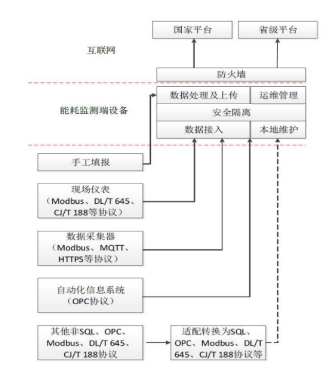 ①支持從現(xiàn)場(chǎng)的儀表獲取數(shù)據(jù):通過(guò) Modbus(GB/T19582)、 DL/T645、CJ/T188 協(xié)議,從現(xiàn)場(chǎng)儀表采集需要的能耗實(shí)時(shí)數(shù)據(jù),并進(jìn)行匯總生成上報(bào)的能耗數(shù)據(jù);